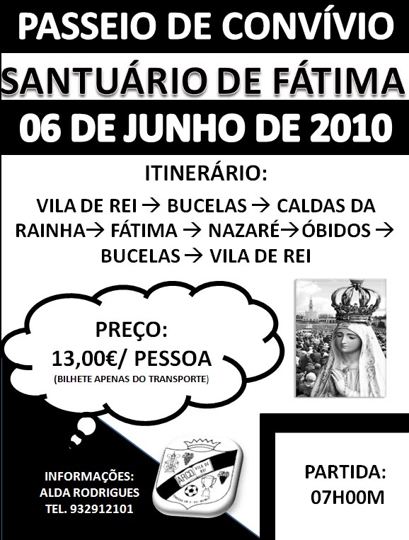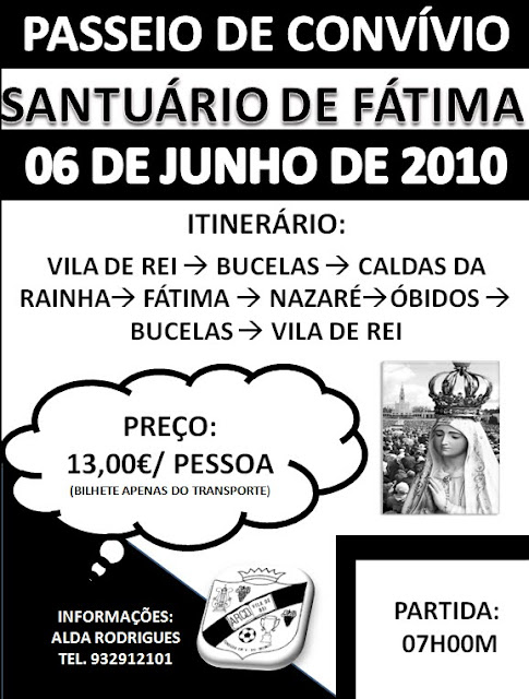 A Associação Recreativa, Cultural e Desportiva de Vila de Rei através da sua Secção de Passeios de Convívio organiza no próximo dia 6 de Junho um Passeio de Convívio a Fátima, Caldas da Rainha, Nazaré e Óbidos. A partida será pelas 7h da Capela de Vila de Rei e do Largo dos Bombeiros Voluntários de Bucelas e o preço do Bilhete do Transporte por pessoa é de 13€.